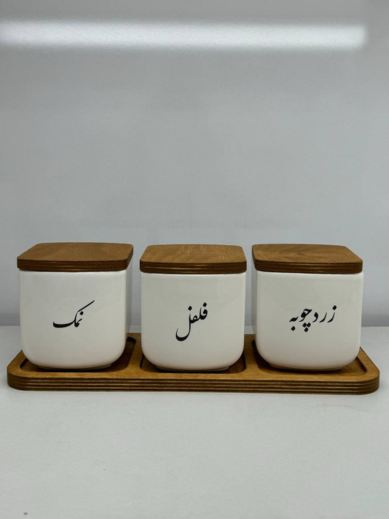 بانکه سرامیکی ادویه طرح پانیذ سایز کوچک تکست زردچوبه - فلفل - نمک