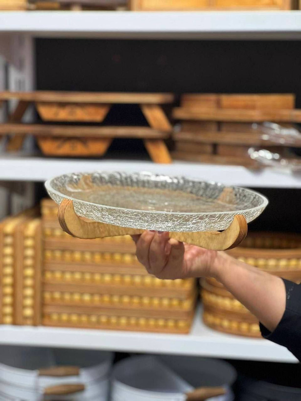 بدنه این شیرینیخوری از شیشه آبگز ساخته شده است که به آن شفافیت و زیبایی خاصی میبخشد. طرح شکستهای که روی این ظرف به کار رفته، جلوهای مدرن و هنری ایجاد میکند که به راحتی میتواند با هر دکوراسیونی هماهنگ شود. 🥳 همچنین، پایه چوبی این محصول، تعادل و استحکام بیشتری به آن میبخشد و حس گرما و طبیعی بودن را به فضا اضافه میکند.
