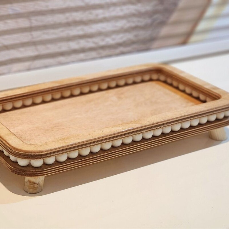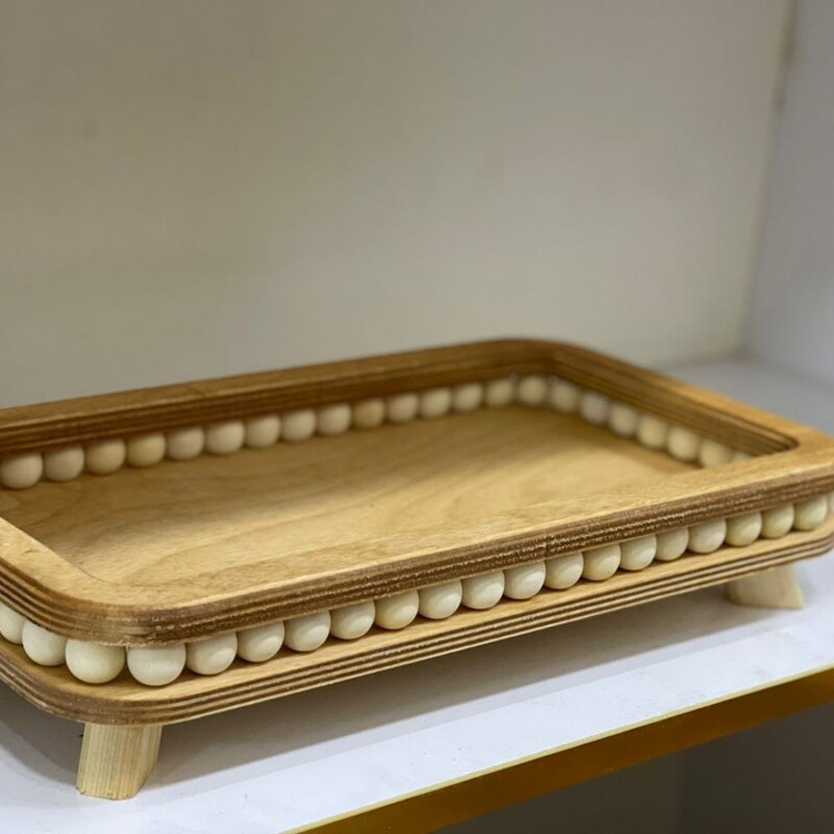 ⚪ **تزئین منحصربهفرد با مهرههای سفید چوبی:** این ردیف مهرهها در دور تا دور سینی، ظاهری خاص و چشمنواز ایجاد کردهاند.