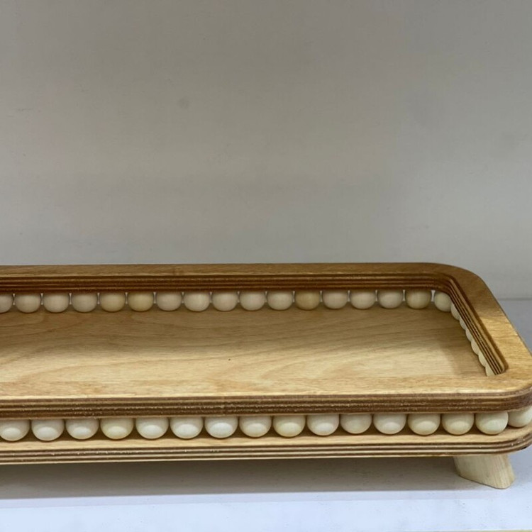 این محصول یک **سینی چوبی مستطیلی تزئینی و کاربردی** است که با طراحی خاص و ترکیب چوب طبیعی و مهرههای سفید، جلوهای گرم و مدرن به فضای شما میبخشد.